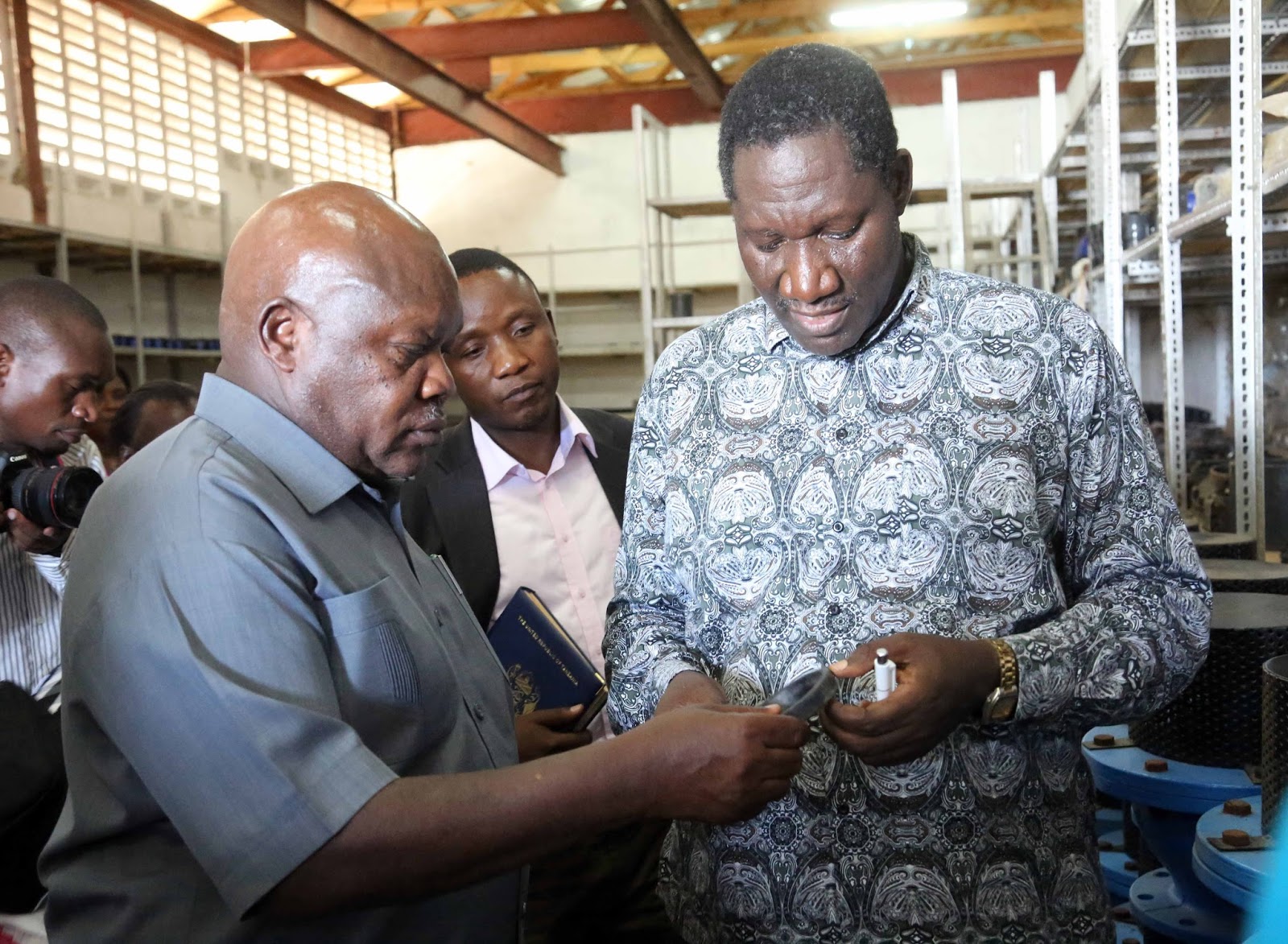 Mhe. Kamwelwe, (kushoto), akionyeshwa moja ya vifaa vya maji vinavyotunzwa kwenye bohari kuu ya maji na Meneja wa Bohari Kuu ya Maji Bw. Clepline Bulamo[/caption]