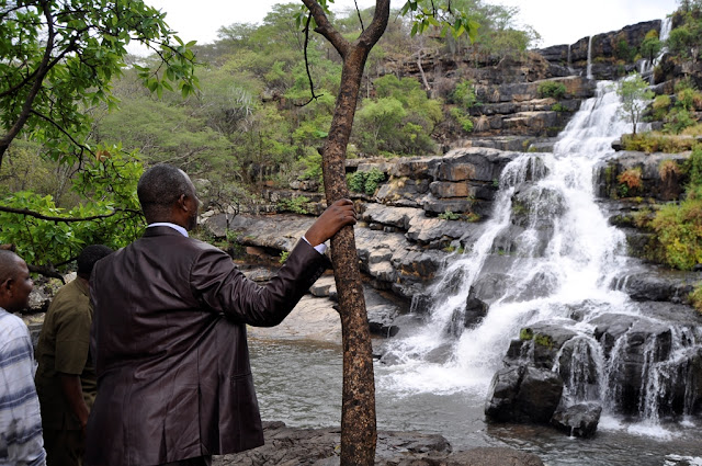 Naibu Waziri wa Maliasili na Utalii, Japhet Hasunga (kushoto) akiangalia maporomoko ya maji ya mto Kimani alipotembelea Pori la Akiba la Mpanga Kipengele katika Wilaya ya Makete Mkoani Njombe. Maporomoko hayo ambayo ni kivutio kikubwa cha utalii katika pori hilo yana urefu wa mita zaidi ya 70.