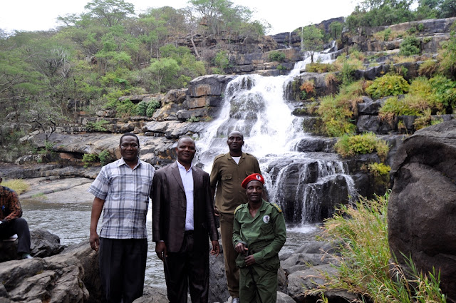 Naibu Waziri wa Maliasili na Utalii, Japhet Hasunga (wa pili kushoto) akionyeshwa maporomoko ya maji ya mto Kimani na Kaimu Meneja wa Pori la Akiba la Mpanga Kipengele, Stanslaus Odhiambo (katikati) alipotembelea maporomoko hayo jana katika Wilaya ya Makete Mkoani Njombe. Maporomoko hayo ambayo ni kivutio kikubwa cha utalii katika pori hilo yana urefu wa mita zaidi ya 70. Kulia ni Mkuu wa Wilaya ya Mbarali, Reuben Mfune.