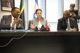 Waziri wa Sheria wa Israel, Mhe. Bibi Ayelet Shaked akiwahutubia mamia ya watu hawapo pichani waliohudhuria hafla ya ufunguzi wa ofisi ya Ubalozi wa Tanzania nchini Israel. Kushoto ni Waziriwa Mambo ya Nje na Ushirikiano wa Afrika Mashariki, Mhe. Dkt. Augustine Mahiga na kulia ni Balozi wa Tanzania nchini Israel, Mhe. Job Masima. |