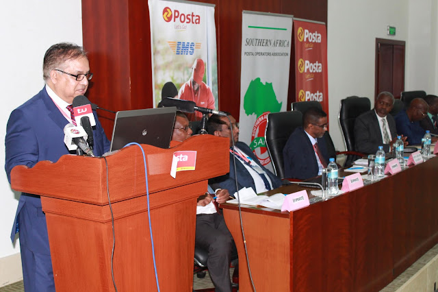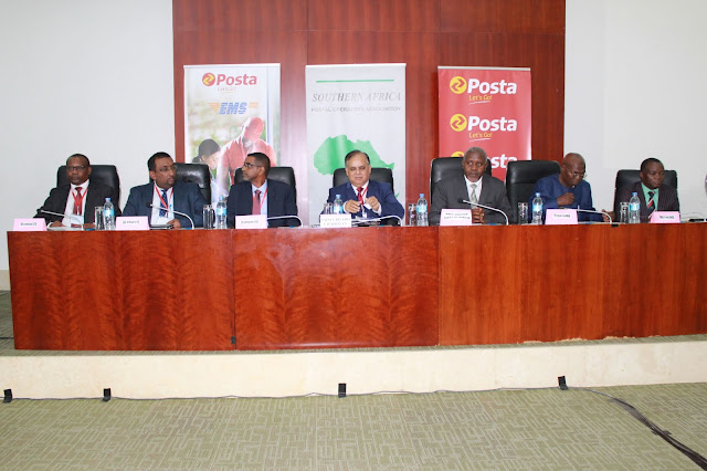 Mgeni rasmi Naibu Waziri wa Ujenzi, Uchukuzi na Mawasiliano (Uchukuzi na Mawasiliano) Mhandisi Atashasta Nditiye (wa tatu kulia) akiwa meza kuu pamoja na baadhi ya wawakilishi wa Umoja wa Posta kwa nchi za Kusini mwa Afrika (SAPOA), katika mkutano wa umoja huo, alioufungua leo, ukumbi wa mikutano wa Kimataifa wa Mwalimu J.K Nyerere jijini Dar es Salaam. Kulia ni Kaimu Postamasta Mkuu wa Shirika la Posta Tanzania (TPC), Hassan Mwan'gombe na wa pili ni Mwenyekiti wa Bodi ya TPC, Kanali Mstaafu, Dk. Haruni Kondo. Baadhi ya wawakilishi kutoka DHL ambao ni wafadhili wa mkutano huo wakifuatilia maelezo mbalimbali kutoka kwa wawakilishi wa nchi mbalimbali za umoja huo. Wawakilishi kutoka Shirika la Posta Tanzania (TPC) wakiskiliza kwa makini maelezo mbalimbali yaliyokuwa yakitolewa na wawakilishi wa nchi za umoja huo, wakati wa ufunguzi wa mkutano huo. Kutoka kushoto ni Kaimu Meneja Uendeshaji wa Biashara, Mwanaisha Saidi, Kaimu Meneja Rasilimali za Shirika, Macrice Mbodo na Meneja Huduma za Fedha, Rehema Mbunda. Baadhi ya wawakilishi kutoka nchi za Kusini mwa Afrika zilizounda umoja huo, wakifuatilia kwa makini hotuba na maelezo mbalimbali yaliyokuwa yakitolewa katika mkutano huo. Baadhi ya wawakilishi wa umoja wa SAPOA, kutoka nchi za Kusini mwa Afrika, wakifuatilia kwa makini mkutano huo. Mtendaji Mkuu wa Posta wa Mauritius, Giandev Moteea, akitoa hotuba yake katika mkutanoni huo.