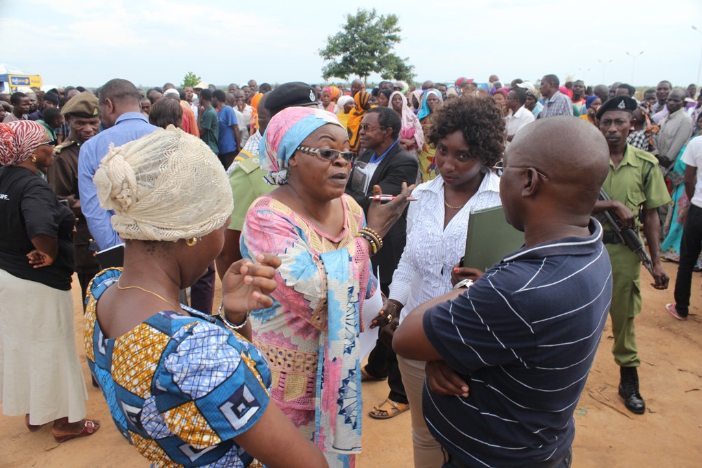 <Mkuu wa wilaya ya Kibaha, Asumpter Mshama akimtambulisha meneja mwajiri wa kampuni ya ujenzi wa reli ya Kisasa ya Yapi Markezi kutoka Uturuki kwa vijana wasotea ajira walioweka kambi yao kijiji cha Soga-Kibaha, Pwani wakati akifanya mkutano nao. Mkuu huyo wa wilaya alifanya ziara hiyo kwa kushirikiana na kamati ya ulinzi na usalama ya wilaya.