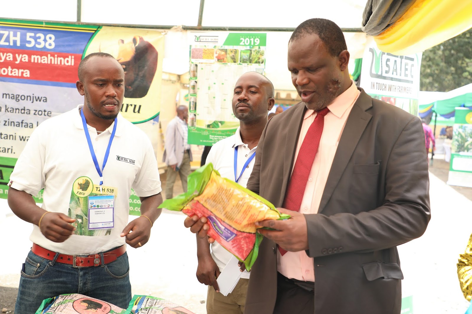 Waziri wa Kilimo Mhe Japhet Hasunga (Mb) akikagua mbegu mbalimbali mara baada ya kutembelea kampuni ya wazalishaji na wasambazaji wa mbegu bora  ya Suba Agro wakati wa kongamano la siku tatu la Kitaifa la Kisayansi kuhusu Bioanuwai, Visumbufu na matumizi sahihi na salama ya teknolojia za viuatilifu linalofanyika katika ukumbi wa Taasisi ya kusimamia na kudhibiti Viuatilifu-TPRI Jijini Arusha, leo tarehe 28 Machi 2019.