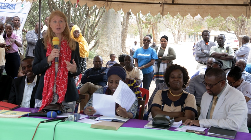 Mwakilishi wa shirika la DFID nchini Tanzania Elizabeth Arthur,ambaopia ni baadhi ya Wafadhiri wa Mazingira na Usafi katika sehemu mbalimbali hapa nchini,akiwasalimia baadhi wa wanakijiji cha Humekwa wilayani Chamwino,waliofika kwenye mkutano wa hadhara,ambapo mgeni rasmi alikuwa WAZIRI wa Afya, Maendeleo ya Jamii, Jinsia, Wazee na watoto Mhe. Ummy Mwalimu ambaye alifika katika kijiji hicho kukagua Usafi wa Mazingira na Vyoo bora kuelekea uzinduzi wa awamu ya pili ya kampeni ya Taifa ya usafi wa Mazingira iliyobeba ujumbe wa 'NIPO TAYARI'., kulia ni Mganga Mkuu