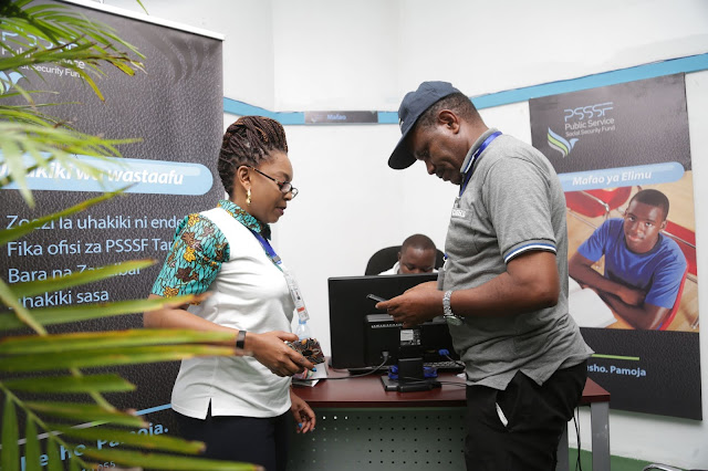 Afisa Uhusiano Mwandamizi PSSSF, Bw. Abdul Njaidi (aliyekaa), kwa kushirikiana na Afisa Mafao, wa Mfuko Bw. Salvatory Matemu kutafuta taarifa za michango ya Mwanachama (hayupo pichani).
