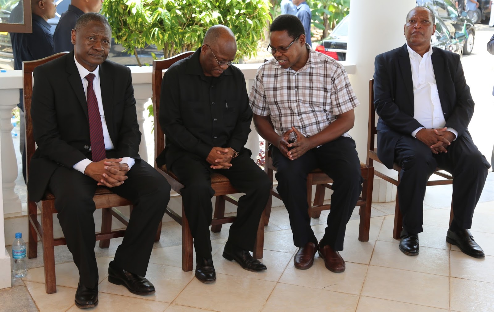 Rais wa Jamhuri ya Muungano wa Tanzania Mhe. Dkt. John Pombe Magufuli akiongea na mtoto wa marehemu, Amani Kisanga, baada ya kutoa heshima za mwisho kwa mwili wa Jaji Mstaafu wa Mahakama ya Rufani Tanzania Mhe. Robert Kisanga nyumbani kwa marehemu Oysterbay Jijini Dar es Salaam leo Jumapili Januari 28, 2018. Pamoja nao kushoto ni Jaji Mkuu wa Tanzania, Profesa Ibrahim Hamis Juma na kulia ni Waziri wa Sheria na Katiba Profesa Palamagamba Kabudi.