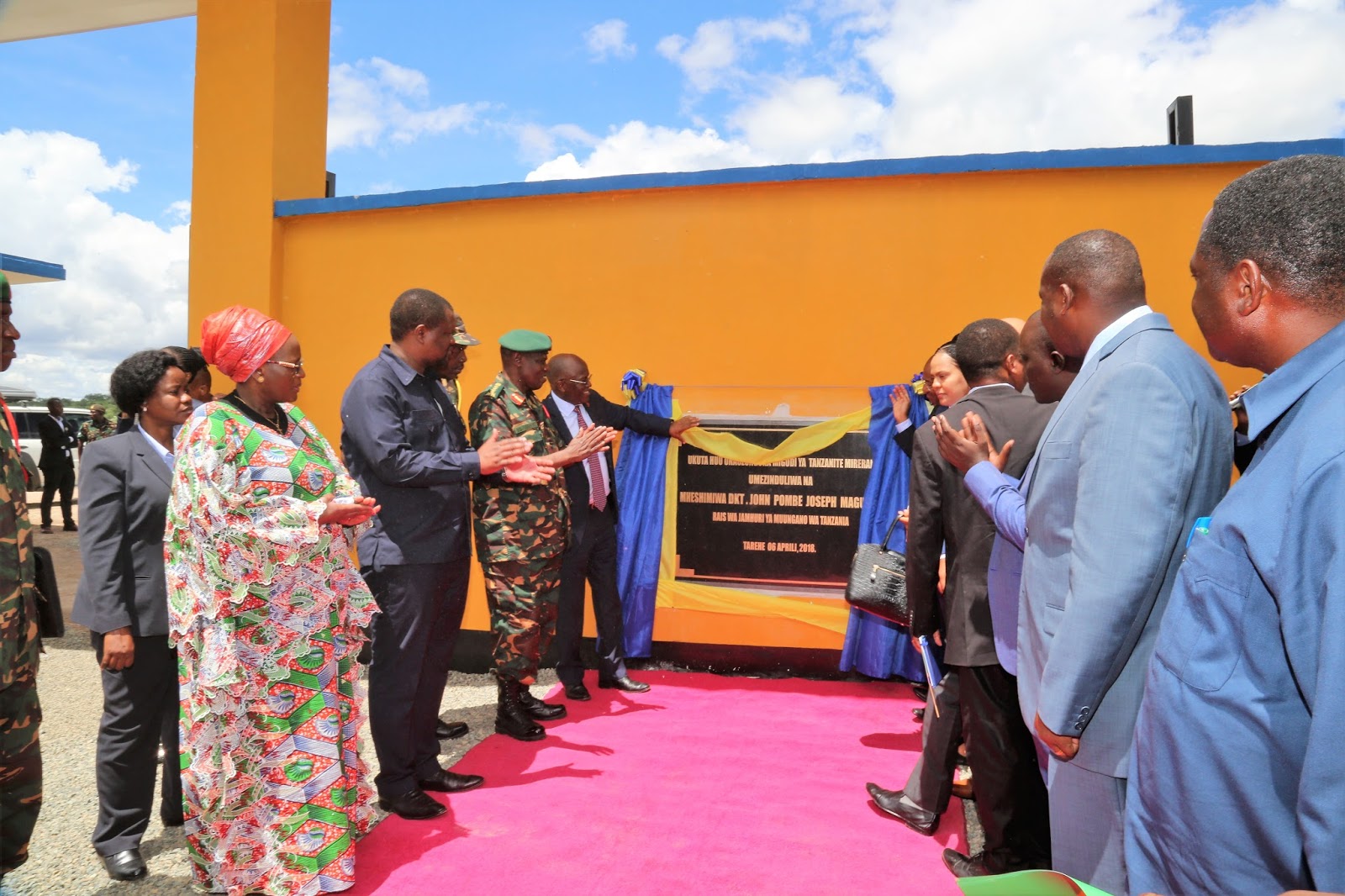 Rais wa Jamhuri ya Muungano wa Tanzania, Dkt. John Pombe Magufuli akifunua pazia kuashiria uzinduzi rasmi wa ukuta wenye urefu wa kilomita 24.5 kuzunguka eneo la migodi ya madini ya Tanzanite huko Mirerani wilayani Simanjiro Mkoa wa Manyara kwenye sherehe za kuzindua ukuta huo leo Aprili 6, 2018.