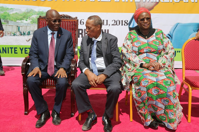 Rais wa Jamhuri ya Muungano wa Tanzania Dkt. John Pombe Magufuli na viongozi wenginme wakimsikiliza Mzee Jumanne Ngoma akitoa shukurani zake kwa kutambuliwa na serikali na kupewa shilingi milioni 1000 na Rais kama ahsante yake wakati wa sherehe za kuzindua rasmi ukuta kuzunguka migodi ya Tanzanite eno la Mirelani wilaya ya Simanjiro mkoa wa Manyara leo Aprili 6, 2018. Kushoto ni Hassan na Asha Ngoma, watoto wa mzee huyo