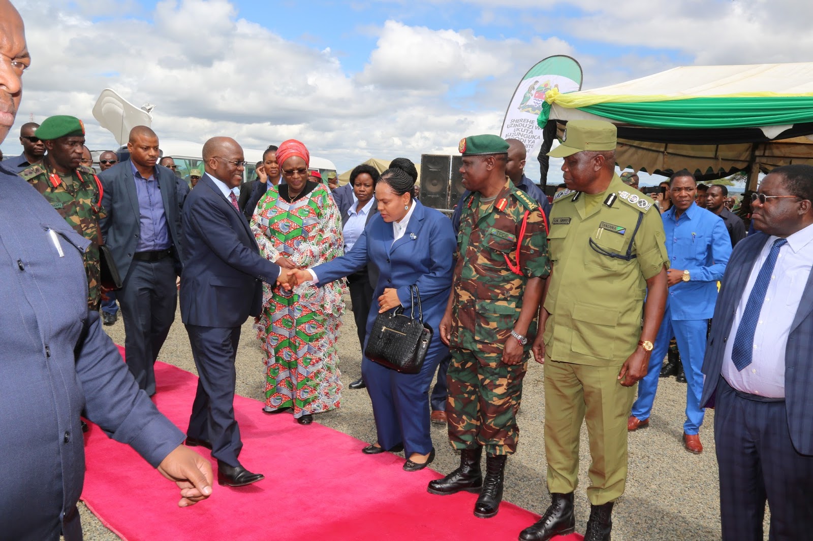 Mke wa Rais Mama Janeth Magufuli akipeana mikono na Asha Ngoma, binti wa Mzee Jumanne Ngoma, mgunduzi wa madini ya Tanzanite wakati wa sherehe za kuzindua rasmi ukuta kuzunguka migodi ya Tanzanite eno la Mirelani wilaya ya Simanjiro mkoa wa Manyara leo Aprili 6, 2018