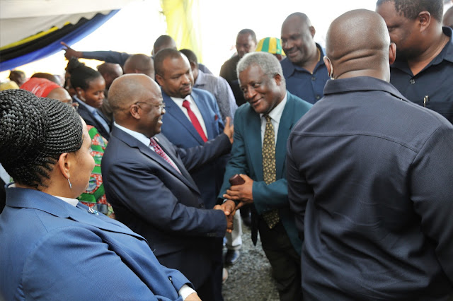 Rais wa Jamhuri ya Muungano wa Tanzania, Dkt. John Pombe Magufuli akisalimiana na Mjumbe wa Kamati ya kudumu ya Ulinzi na Usalama ya Bunge na Mbunge wa Morogoro Vijijini Mhe. Prosper Mbena wakati wa sherehe za uzinduzi wa ukuta wenye urefu wa kilomita 24.5 kuzunguka eneo la migodi ya madini ya Tanzanite huko Mirerani wilayani Simanjiro Mkoa wa Manyara leo Aprili 6, 2018.