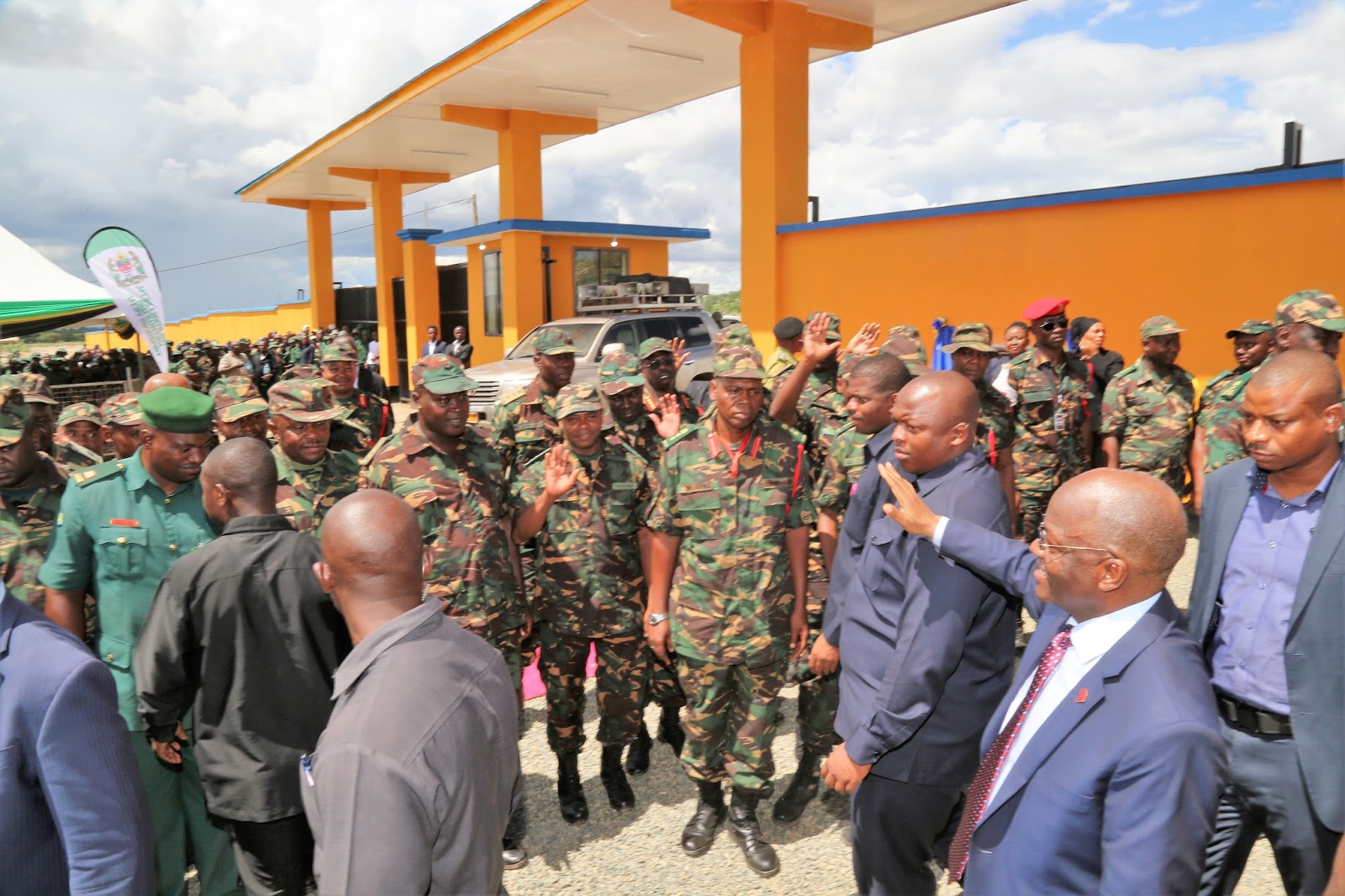 Rais wa Jamhuri ya Muungano wa Tanzania, Dkt. John Pombe Magufuli akiaga watendaji wa JWTZ na JKT waliosimamia kazi za ujenzi wa ukuta wenye urefu wa kilomita 24.5 kuzunguka eneo la migodi ya madini ya Tanzanite huko Mirerani wilayani Simanjiro Mkoa wa Manyara kwenye sherehe za kuzindua ukuta huo leo Aprili 6, 2018.