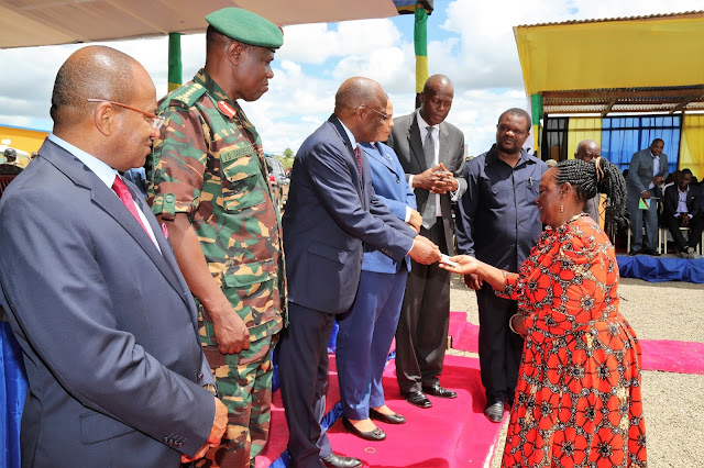 Rais wa Jamhuri ya Muungano wa Tanzania Dkt. John Pombe Magufuli akipokea mfano wa funguo kutoka kwa Waziri wa Ulinzi na Jeshi la Kujenga Taifa Dkt. Husssein Mwinyi wakati wa sherehe za kuzindua rasmi ukuta kuzunguka migodi ya Tanzanite eno la Mirelani wilaya ya Simanjiro mkoa wa Manyara leo Aprili 6, 2018
