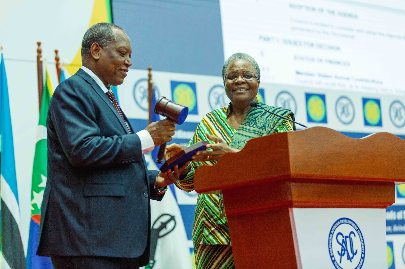 Waziri wa Mambo ya Nje na Ushirikiano wa Afrika Mashariki wa Tanzania, Profesa Palamagamba Kabudi (kushoto) akipokea ngao kutoka kwa Naibu Waziri Mkuu na Waziri wa Ushirikiano wa Kimataifa wa Namibia Nemtumbo Nandi ikiwa ni ishara ya kuupokea uenyekiti wa Baraza la Mawaziri wa Jumuiya ya Maendeleo Kusini mwa Afrika (SADC).