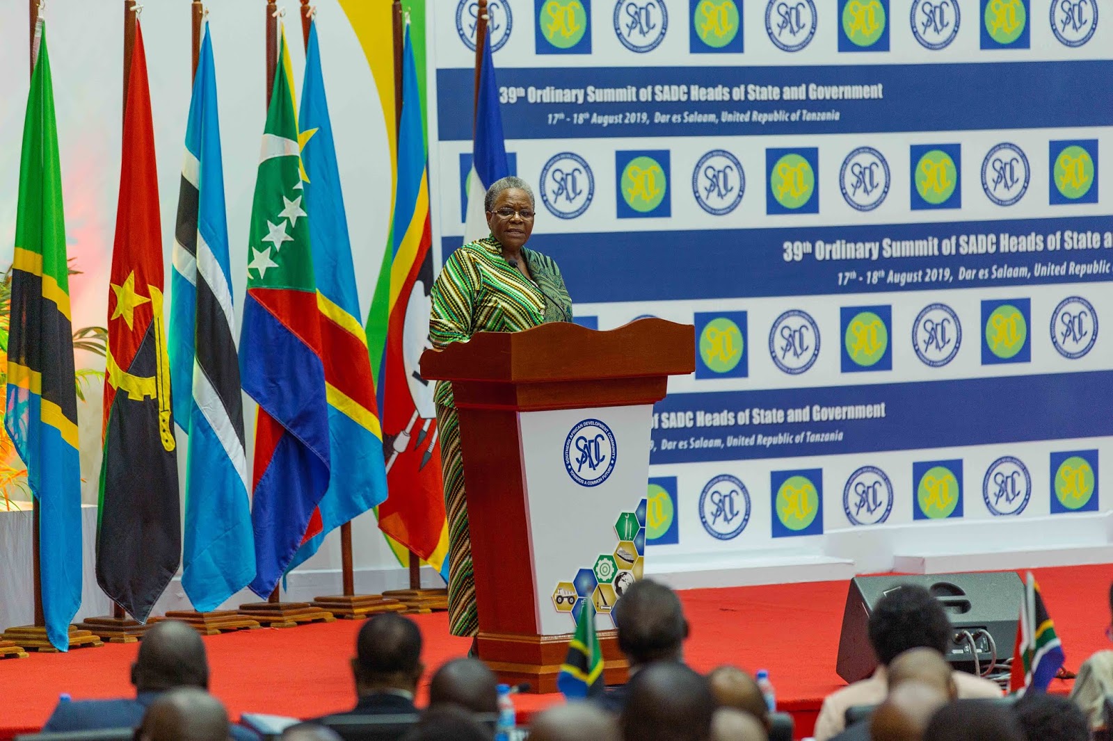 Naibu Waziri Mkuu wa Namibia na Waziri wa Mambo ya Nje wa nchi hiyo Mhe. Netumbo Nandi- Naitwah akitoa hotuba yake wakati wa ufunguzi wa mkutano wa Mawaziri wa Nchi za SADC unaondelea jijini Dar es Salaam, Tanzania. Ambapo Tanzania ni mwenyeji wa Mkutano huo wa 39.