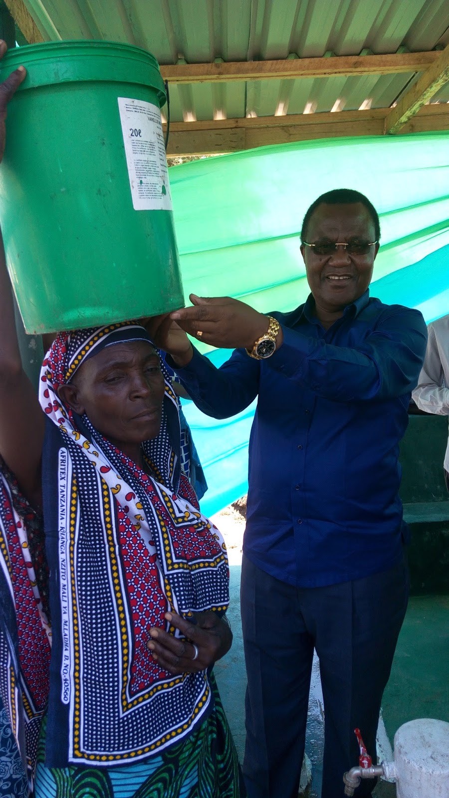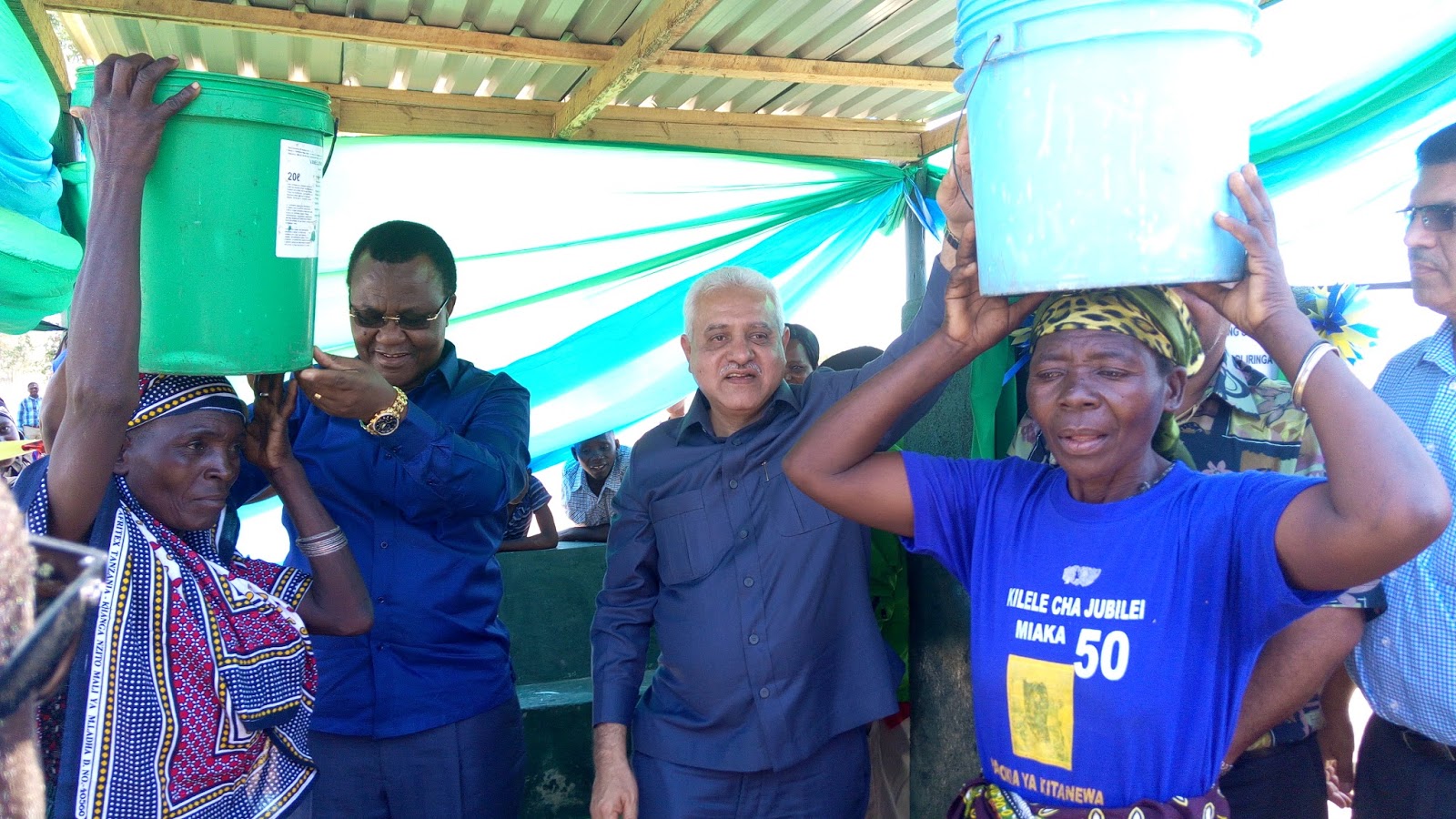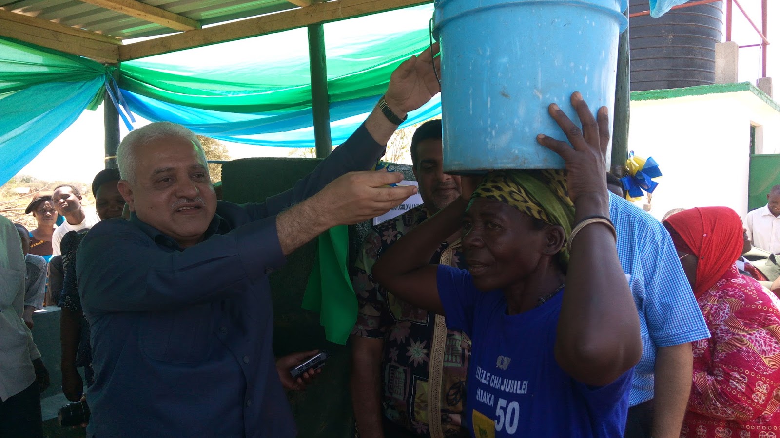 | makamu wa Rais wa Jumuiya ya Ismailia nchini Kamal Khimji akimtwisha ndoo ya maji mwanamke mkazi wa Mapogolo baada ya kuzindua visima viwili |