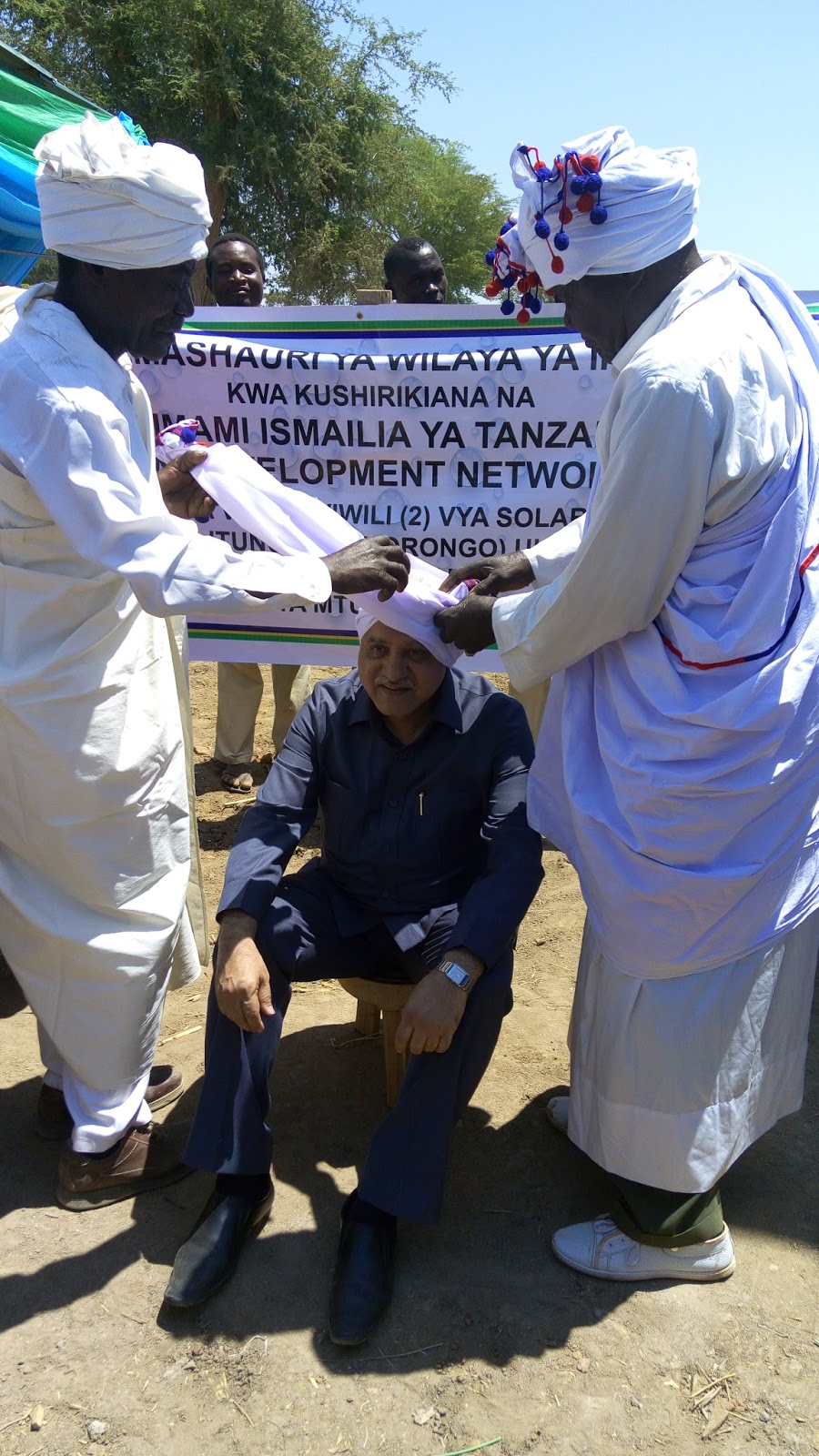 | makamu wa Rais wa Jumuiya ya Ismailia nchini Kamal Khimji akivishwa mgolole nguo za heshima ya kichifu kabila la wahehe kama heshima kubwa ya kusaidia jamii |