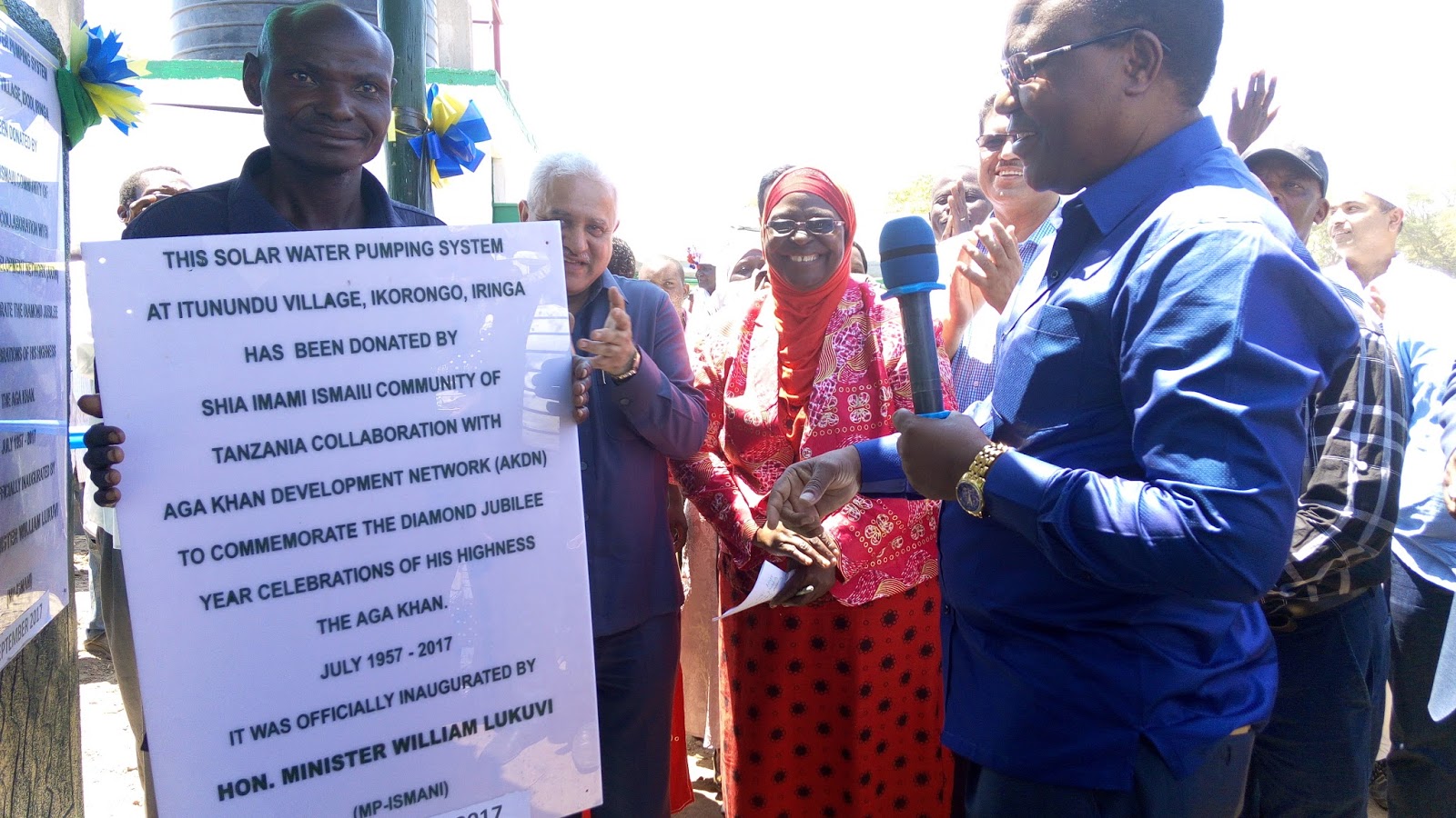 | Waziri Lukuvi (kushoto) na makamu wa Rais wa Jumuiya ya Ismailia nchini Kamal Khimji wakizindua moja kati ya kisima katika kijiji cha Mapogolo |