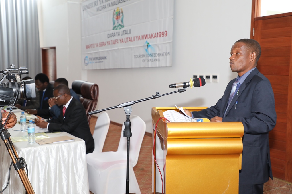 Kaimu Mkurugenzi Mkuu wa ESRF, Deodatus Sagamiko akizungumza katika warsha hiyo. ESRF ni moja ya wadau wakuu waliofadhili zoezi hilo la kuhuisha sera ya taifa ya utalii.