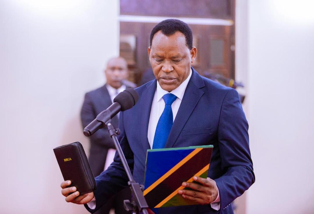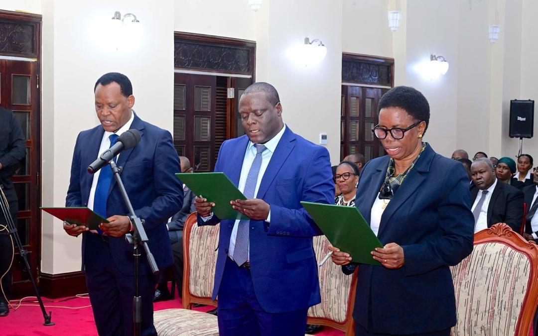 Kutoka kulia, Katibu Mkuu Ofisi ya Rais Maendeleo ya Vijana, Bi. Jenifa Christian Omolo, Naibu Katibu Mkuu Ofisi ya Rais Maendeleo ya Vijana, Dkt. Kedmon Elisha Mapana na Balozi Lazaro Samuel Nyalandu kwa pamoja wakiapa Kiapo cha Maadili kwenye hafla iliyofanyika Ikulu Chamwino mkoani Dodoma tarehe 21 Novemba, 2025.