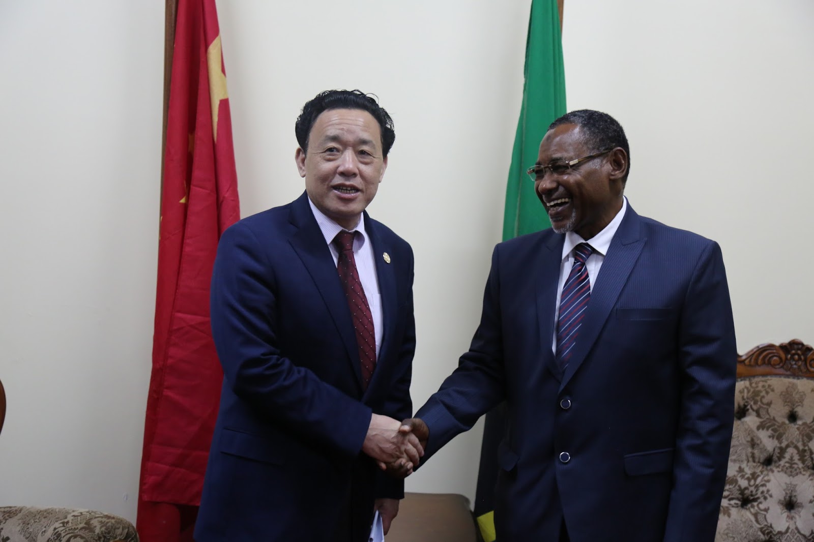 Mhe. Hamad Rashid akiagana na Dkt. QU DONGYU mara baada ya kumaliza mazungumzo yao. |