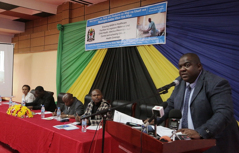 Mkurugenzi wa Idara ya Uratibu wa Sekta kutoka Ofisi ya Rais, Tawala za Mikoa na Serikali za Mitaa (OR – TAMISEMI), Dkt. Andrew Komba ambaye pia ni mgeni rasmi katika uzinduzi wa Jarida lenye Mwongozo wa Taifa wa Huduma za Maji na Usafi wa Mazingira katika vituo vya afya,akizungumza mapema leo mjini Dodoma mbele ya Wadau mbalimbali wa mambo ya Afya,ikiwa ni sehemu ya kuelekea kilele cha uzinduzi wa kampeni ya Unawaji Mikono kwa vituo vya Afya itakayojulikana kwa jina la NIPO TAYARI awamu ya pili,Ambapo katika uzinduzi wa kampeni hiyo itakayozinduliwa rasmi Desemba 7,2017 mkoani Dodoma.[/caption]