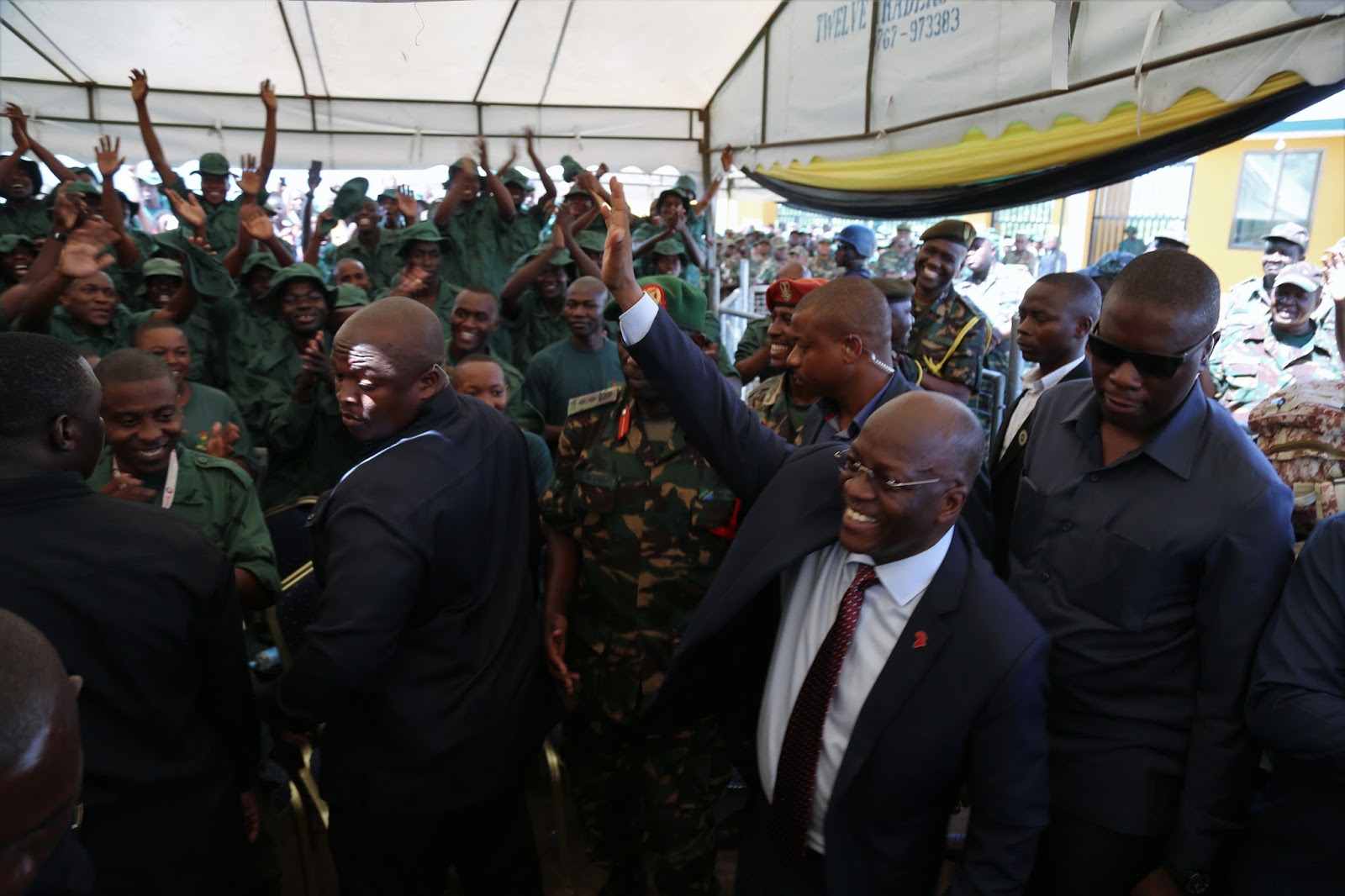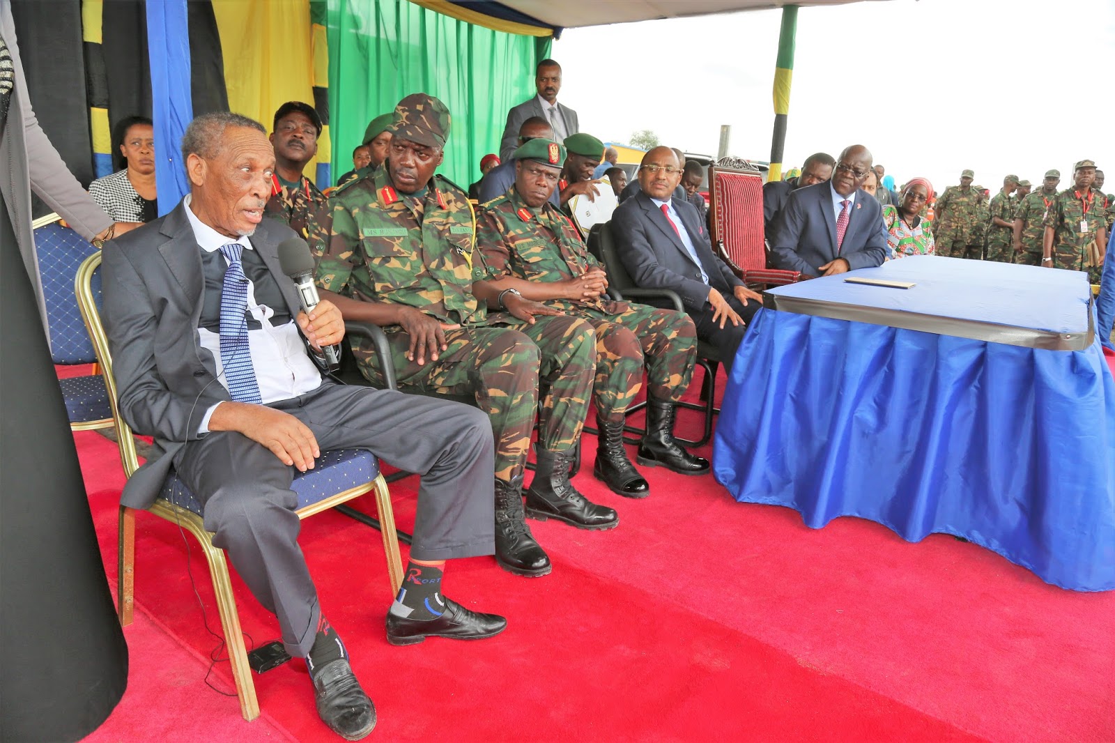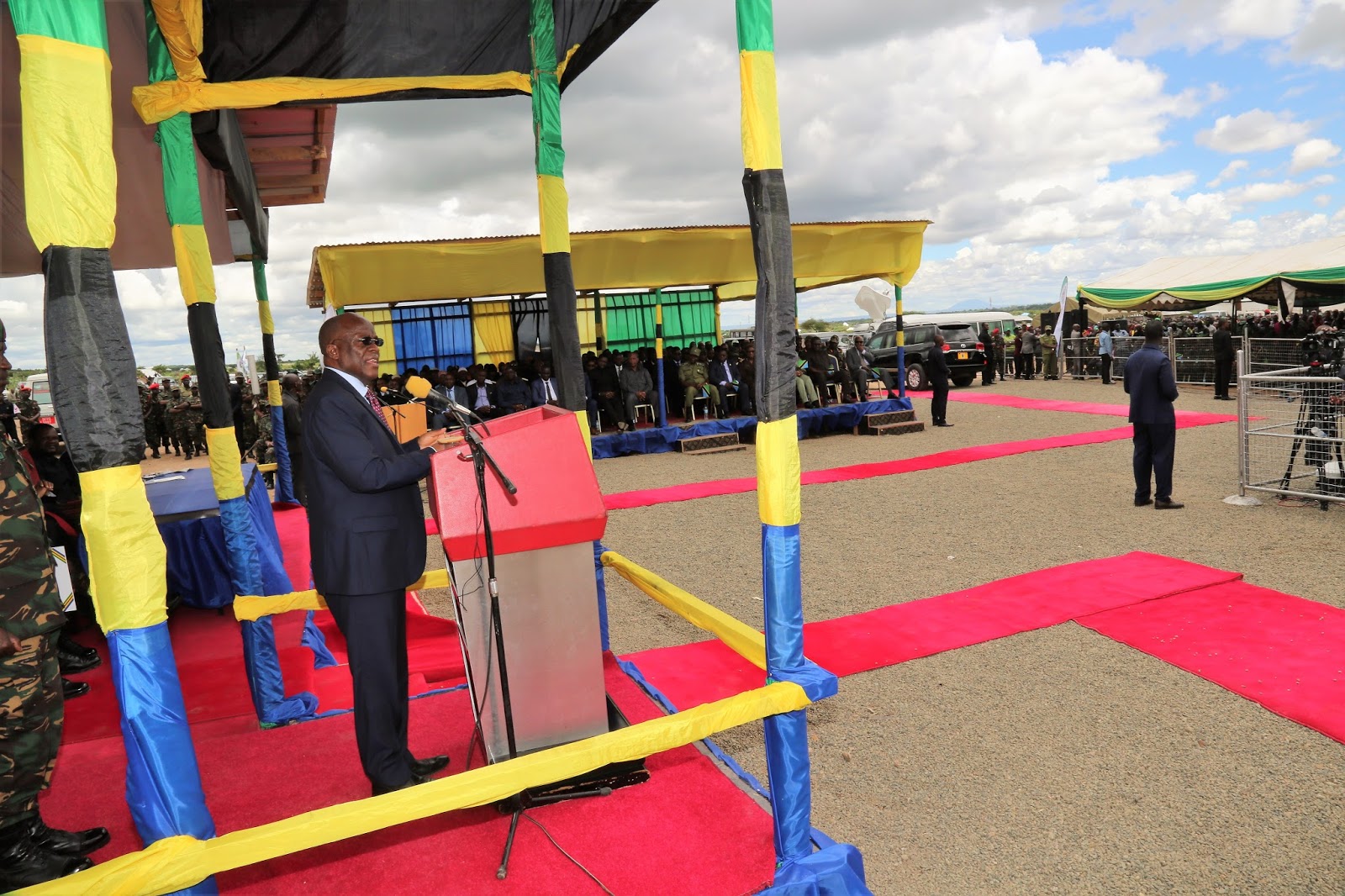 Rais wa Jamhuri ya Muungano wa Tanzania, Dkt. John Pombe Magufuli akiaga watendaji wa JWTZ na JKT waliosimamia kazi za ujenzi wa ukuta wenye urefu wa kilomita 24.5 kuzunguka eneo la migodi ya madini ya Tanzanite huko Mirerani wilayani Simanjiro Mkoa wa Manyara kwenye sherehe za kuzindua ukuta huo leo Aprili 6, 2018.