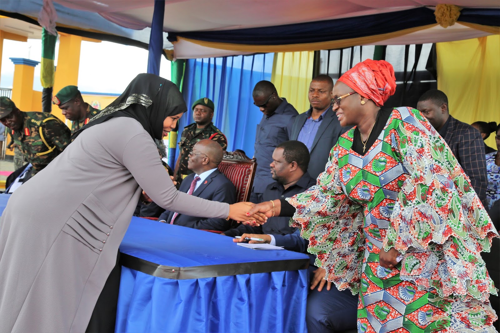 Mke wa Rais Mama Janeth Magufuli akipeana mikono na Asha Ngoma, binti wa Mzee Jumanne Ngoma, mgunduzi wa madini ya Tanzanite wakati wa sherehe za kuzindua rasmi ukuta kuzunguka migodi ya Tanzanite eno la Mirelani wilaya ya Simanjiro mkoa wa Manyara leo Aprili 6, 2018