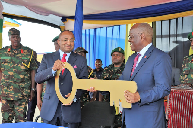 Rais wa Jamhuri ya Muungano wa Tanzania Dkt. John Pombe Magufuli akipokea mfano wa funguo kutoka kwa Waziri wa Ulinzi na Jeshi la Kujenga Taifa Dkt. Husssein Mwinyi wakati wa sherehe za kuzindua rasmi ukuta kuzunguka migodi ya Tanzanite eno la Mirelani wilaya ya Simanjiro mkoa wa Manyara leo Aprili 6, 2018