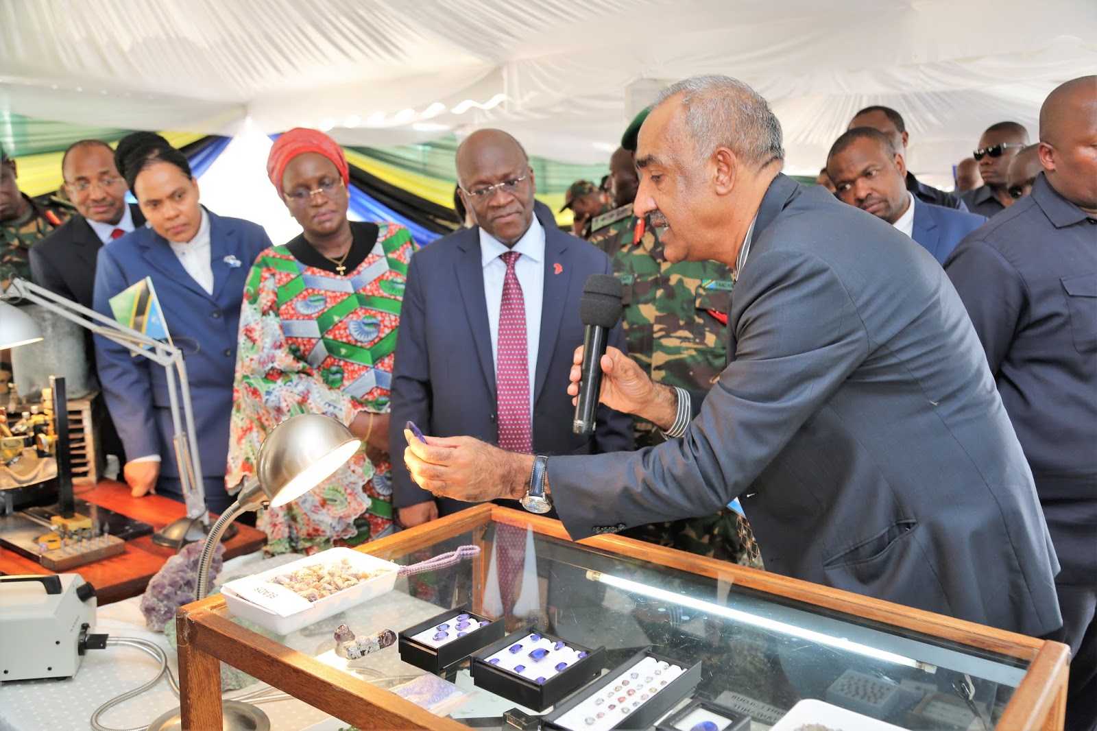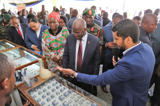 Rais wa Jamhuri ya Muungano wa Tanzania Dkt. John Pombe Magufuli akitembelea maonesho ya madini ya Tanzanite wakati wa sherehe za kuzindua rasmi ukuta kuzunguka migodi ya Tanzanite eno la Mirelani wilaya ya Simanjiro mkoa wa Manyara leo Aprili 6, 2018