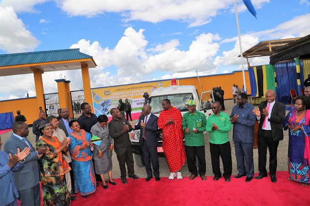 Rais wa Jamhuri ya Muungano wa Tanzania Dkt. John Pombe Magufuli akikabidhi gari la wagonjwa kwa uongozi wa serikali ya Wilaya ya Simanjiro wakati wa sherehe za kuzindua rasmi ukuta kuzunguka migodi ya Tanzanite eno la Mirelani wilaya ya Simanjiro mkoa wa Manyara leo Aprili 6, 2018