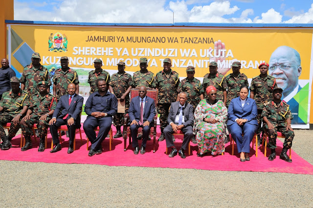 Rais wa Jamhuri ya Muungano wa Tanzania, Dkt. John Pombe Magufuli na mkewe Mama Janeth Magufuli na viongozi wengine katika picha ya pamoja na watendaji wa JWTZ na JKT waliosimamia kazi za ujenzi wa ukuta wenye urefu wa kilomita 24.5 kuzunguka eneo la migodi ya madini ya Tanzanite huko Mirerani wilayani Simanjiro Mkoa wa Manyara kwenye sherehe za kuzindua ukuta huo leo Aprili 6, 2018.