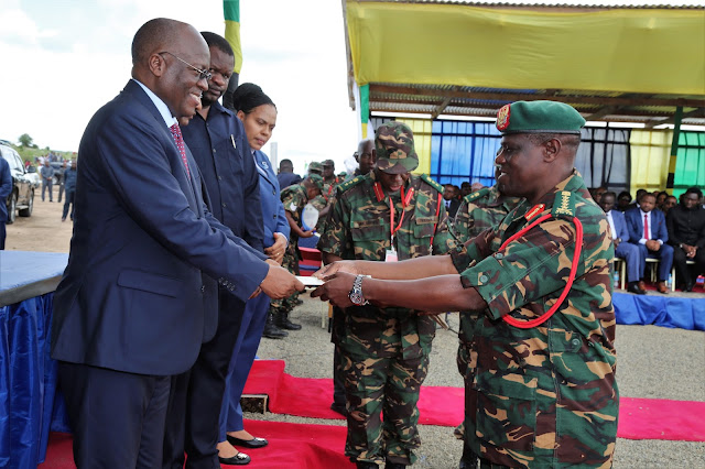 Rais na Amiri Jeshi Mkuu, Dkt. John Pombe Magufuli akimkabidhi hati ya shukrani Mkuu wa Jeshi la Ulinzi Jenerali Venance Mabeyo baada ya jeshi hilo kukamilishi mbele ya wakati ujenzi wa ukuta wenye urefu wa kilomita 24.5 kuzunguka eneo la migodi ya madini ya Tanzanite huko Mirerani wilayani Simanjiro Mkoa wa Manyara kwenye sherehe za kuzindua ukuta huo leo Aprili 6, 2018.