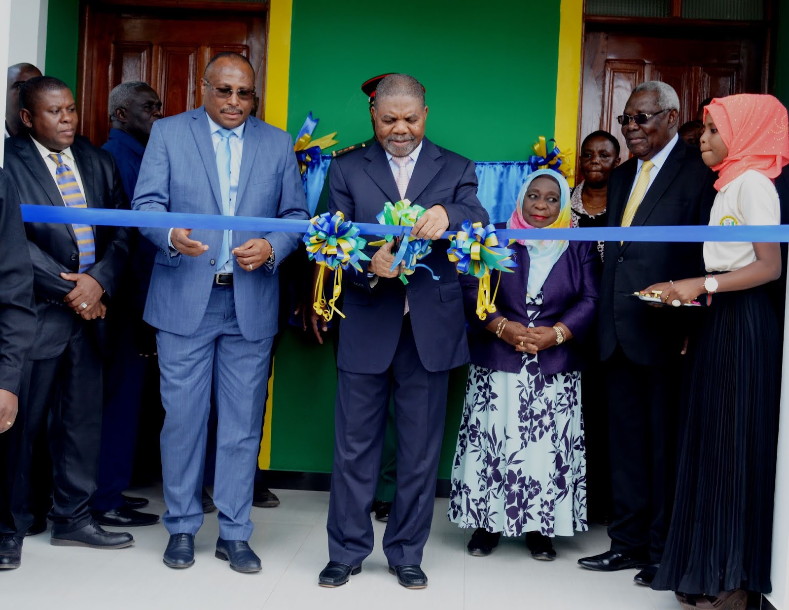 RAIS wa Zanzibar na Mwenyekiti wa Baraza la Mapinduzi Mhe. Dkt. Ali Mohamed Shein, akikata utepe kuashiria Uzinduzi wa Vituo vya Usajili wa Vitambulisho vya Mzanzibar na Uzinduzi wa Uimarishaji Mfumo wa Usajili kielektroniki, (kushoto ni Waziri wa Nchi Ofisi ya Rais Tawala za Mikoa na Idara Maalum za SMZ Mhe. Haji Omar Kheri, na (kushoto) Mke wa Rais wa Zanzibar Mama Mwanamwema Shein na Makamu wa Pili wa Rais wa Zanzibar Mhe. Balozi Seif Ali Iddi, wakishuhudia hafla hiyo iliofanyika katika viwanja vya Ofisi hiyo Dunga Wilaya ya Kati Unguja.