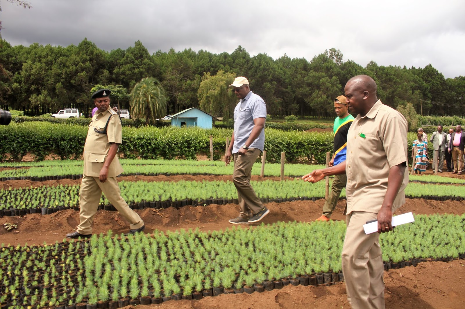 Meneja wa Shamba la Miti la North Kilimanjaro (Rongai) Ernest Madata akimuonesha Naibu Waziri wa Maliasili na Utalii,Constantine Kanyasu sehemu ya vitalu vya miti vinavyoandaliwa na shamba hilo.