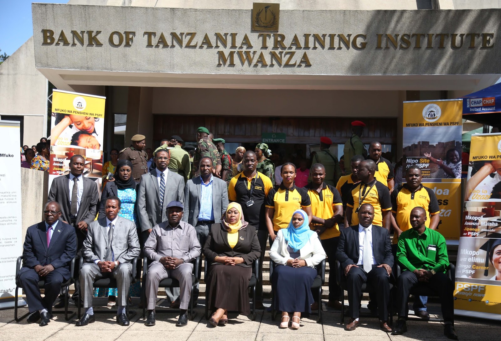 Makamu wa Rais wa Jamhuri ya Muungano wa Tanzania, Mhe. Samia Suluhu Hassan akiwa katika picha ya pamoja na Naibu Waziri wa Fedha na Mipango, Dkt. Ashatu Kijaji, (kulia kwake), Mkuu wa Mkoa wa Mwanza, Bw.John Mongella, (kushoto kwake), Mkurugenzi Mkuu wa PSPF, Bw. Adam Mayingu, (wapili kulia), na Kaimu Mwenyekiti wa Bodi ya Wadhamini wa PSPF, Bw.Nyakimuro Muhoji, viongozi wengine na wafanyakazi wa PSPF